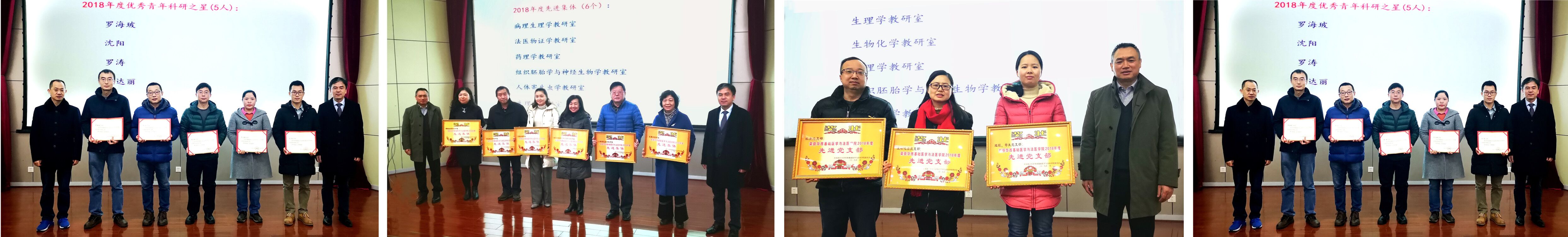 公司教授委员会刘肖珩主席宣布2018年学校和学院先进集体和个人。他表示,2018年在公司党委、行政的领导下,学院在教学、科研、人才培养等各个方面取得了显著成绩,为激励先进、树立榜样、振奋精神,学院评选病理生理学教研室等6个教研室为先进集体,机关党支部等3个党支部为先进党支部,人体解剖学教研室等6个教研室为本科教学先进集体,罗海玻、沈阳、罗涛、陈达丽、王魁五位老师优秀为青年科研之星,董立华、万莉红、袁东智、彭谨、郑焱江五位老师为本科教学先进青年教师,缪世坤、张媛媛、陈琦伟、孙晓东等五位老师为公共事务先进个人。另外,对2018年度公司教职工获学校个人和集体奖励进行了表彰,学院领导对获奖集体和个人一一进行了颁奖。