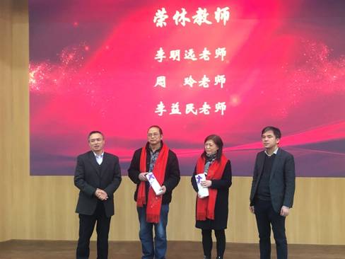 刘肖珩主席宣读2019年荣休教师名单,分别是:李明远老师、周玲老师、李益明老师。党委书记李昌龙、经理黄灿华为荣休教师颁发纪念礼品并对荣休教师数十年来对学院的贡献表达真挚的感谢与诚挚的祝福。