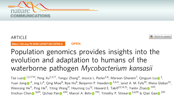 近日,公司罗涛副研究员联合复旦大学高谦教授团队及国内外多家机构在Nature Communications在线发表了题为“Population genomics provides insights into the evolution and adaptation to humans of the waterborne pathogen Mycobacterium kansasii”的论文。公司罗涛副研究员为论文共同第一作者及共同通讯作者,英国上市公司365为论文第一单位。