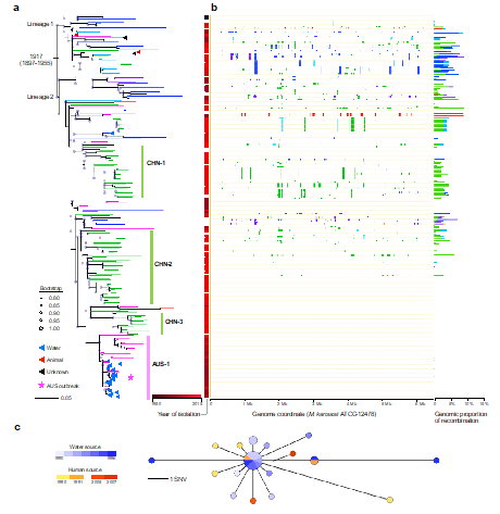 本研究对从全球17个国家不同年代(1990-2015)收集的堪萨斯分枝杆菌进行了基因组测序和群体基因组学分析(图1)。结果表明,全球各地的堪萨斯分枝杆菌间有较近的亲缘关系,其祖先大致起源于上世纪初的欧洲,然后随全球化进程播散到世界各地。分析发现,大多数临床菌株基因组上都存在大量其他水源分枝杆菌的核酸片段,这与只能在人群中传播的结核分枝杆菌截然不同;该结果为堪萨斯分枝杆菌主要通过水源性途径感染人类这一前期推论提供了首个遗传学证据。进一步分析1990-1996年间澳大利亚发生的一次爆发流行证实,临床聚集性感染是由不同个体暴露于带菌水体所致,并未发现“人传人”证据。
