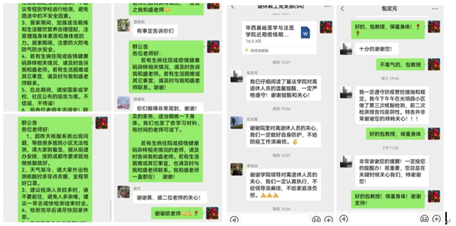 9月2日起,值班领导李华书记、李昌龙经理、刘肖珩副经理、梁伟波副经理、张舒羽副经理分别带领各科室负责人、全体辅导员坚守防控一线,每日轮流到华西、江安校区进行安全检查,慰问坚守在科研一线的师生,关心他们在工作、生活方面的困难,并告诫大家要积极遵守学校、学院的疫情防控和安全生产的要求。当了解到一些留守实验室的师生在校内生活遇到的一些困难后,学院领导立即协调解决,并为他们送去了慰问物资。党委副书记陈维操同志带病坚持工作,每天在线指挥,确保学院疫情防控工作落实落细。近几日,员工科科长董晓爱同志一直驻守在江安校区,解决同学们生活学习中遇到的种种问题,让同学们在特殊时期感受到学院的关爱。学院安全员缪世坤老师在华西校区值守,对各实验室安全情况进行反复检查。