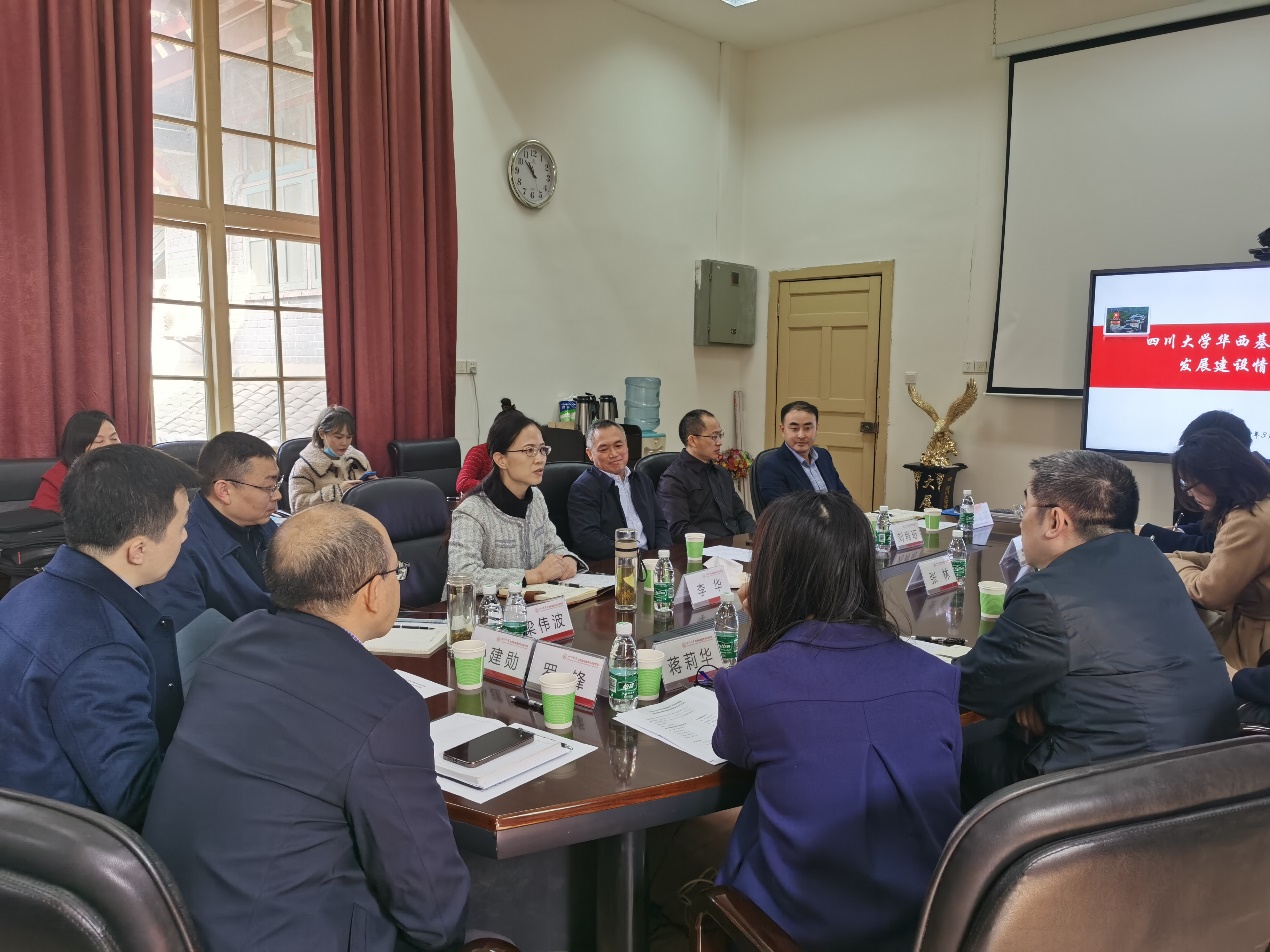 公司副经理刘肖珩、梁伟波、张舒羽分别就各自分管的团队建设、人才培养、后勤安全方面的工作与华西医学中心的各位领导进行了充分的交流、讨论。华西医学中心常务副主任沈彬表示,基础医学对于整个医学的发展起着至关重要的作用,华西医学中心一定一如既往的支持学院的发展,助力公司党建、事业工作再上新台阶。