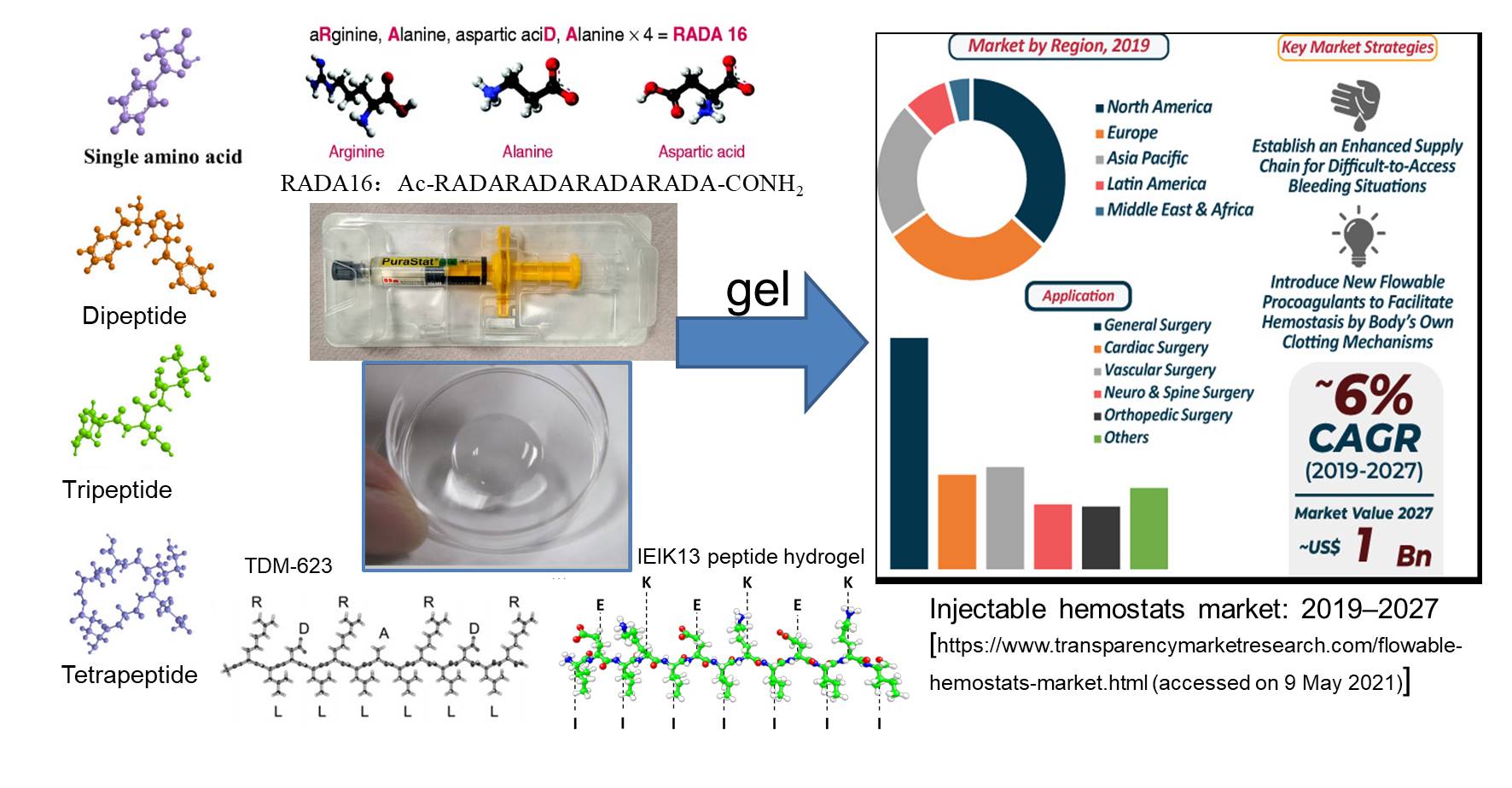 近日,学院杨泽宏副教授在线发表了题为“Short Peptide Nanofiber Biomaterials Ameliorate Local Hemostatic Capacity of Surgical Materials and Intraoperative Hemostatic Applications in Clinics”的长篇综述文章,杨泽宏副教授和公司海外员工赵晓军教授为该论文共同通讯作者,英国正版365官方网站为第一署名单位。该论文系统阐述了自组装肽生物材料与天然水凝胶或各种聚合物水凝胶等支架材料在外科止血材料应用上相比较的好处和优点,并从外科技术角度深度剖析了当前自组装肽纳米止血材料在临床医学应用中的特点、进展与现状,特别是在非压迫性躯干出血、弥漫性粘膜表面出血和内部医学出血等情况下,自组装肽生物材料是创制生物活性神经支架、鼻腔填充物、胃肠道的大面积粘膜表面覆盖(食道、胃病变、十二指肠和下消化道)、心外膜细胞黏附载体、光学透明的止血基质屏障等方面具有外科临床应用潜力。在本文描述的多种外科专业与亚专业中,基于自组装肽生物材料的纳米止血装置(PuraStatÒ、AC5、TDM-621、TDM-623和SPG-178)实现了安全、有效和快速的术内止血效应,并有效促进体内外科伤口愈合与降低延迟出血、再出血、术后出血或相关并发症等风险,对不同临床止血模式下的体内生物安全性、出血适应症、组织密封质量、手术可行性和局部可用性进行全面而有序的外科技术分析与总结。