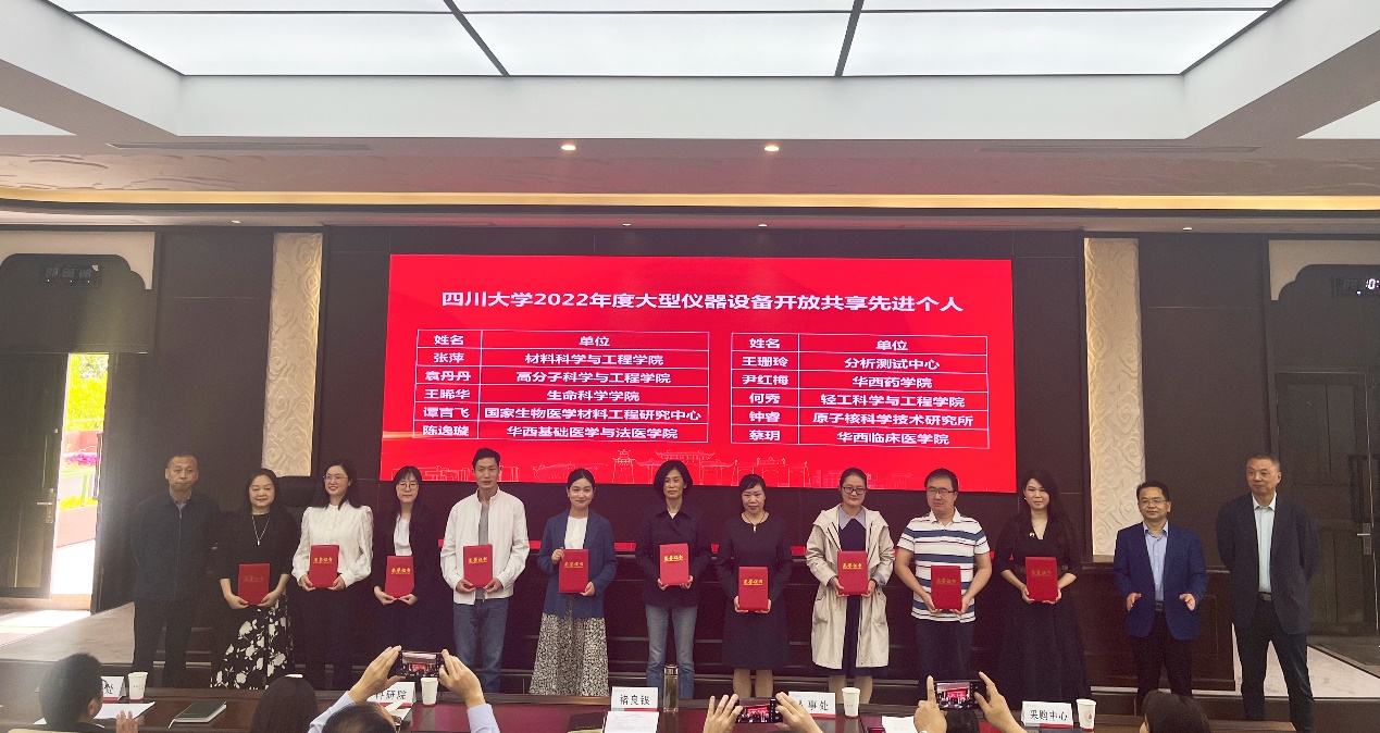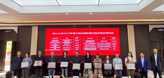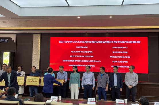 褚良银副董事长向公司张舒羽副经理(左五)颁发“英国上市公司3652022大型仪器设备开放共享先进单位”奖牌